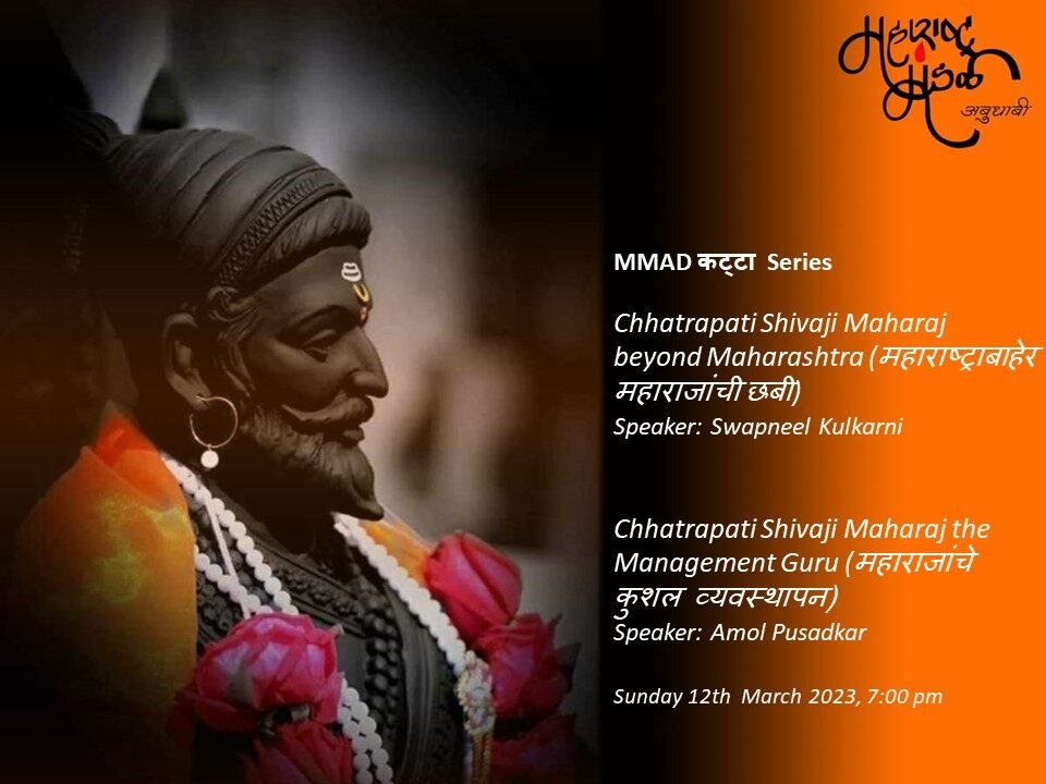 Introductory speech Speaker: Shri. Vijay Patil, Founder “Shivaji Maharaj Antarrashtriya Parivaar (SMAP)” Chhatrapati Shivaji Maharaj beyond Maharashtra (महाराष्ट्राबाहेर महाराजांची छबी) Speaker: Shri. Swapneel Kulkarni Chhatrapati Shivaji Maharaj the Management Guru (महाराजांचे कुशल व्यवस्थापन) Speaker: Shri. Amol Pusadkar Date: Sunday 12th March 2023 Start time: 7:00 pm Conducted via Zoom Meeting