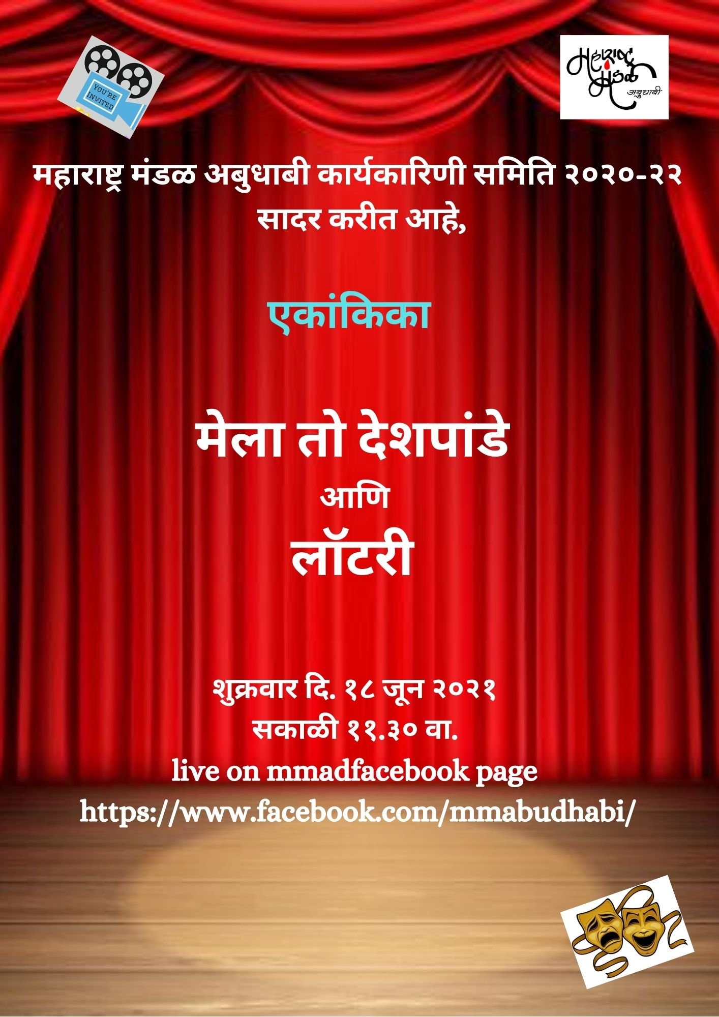 *नमस्कार मंडळी,* रोटरी क्लब ऑफ पुणे हेरिटेज डिस्ट्रिक ३१३१ आयोजित *विश्व मराठी एकांकिका स्पर्धा २०२१* मध्ये महाराष्ट्र मंडळ अबु धाबी तर्फे पाठविण्यात आलेल्या व विविध पारितोषिके मिळालेल्या दोन्ही एकांकिकांचे Telecast *१) मेला तो देशपांडे* *२) लाॅटरी* आपल्या सर्वांसाठी Facebook live द्वारे *शुक्रवार दिनांक 18/06/2021* *रोजी सकाळी 11:30* *वा. (UAE Time)* प्रसारित करण्यात येणार आहेत.