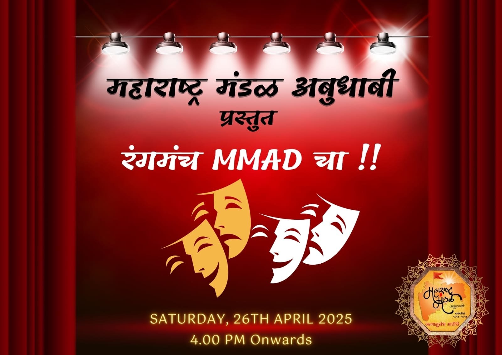 नमस्कार नाट्य रसिकहो, महाराष्ट्र मंडळ अबुधाबी घेऊन येत आहे MMAD च्या हौशी रंगकर्मीं साठी सुवर्णसंधी !! 🎭 तुमच्या अभिनय, नेपथ्य आणि तांत्रिक कौशल्याचा प्रभाव रंगमंचावर दर्शविण्याची अद्वितीय संधी! 🎭 Participation Categories 1️⃣ अभिनय (Acting) 2️⃣ नेपथ्य सहाय्य (Backstage Support) 3️⃣ तांत्रिक सहाय्य (Technical Support) – Lights, Sound & Properties 📆Event Date: 26th April 2025 ⏰Time: […]