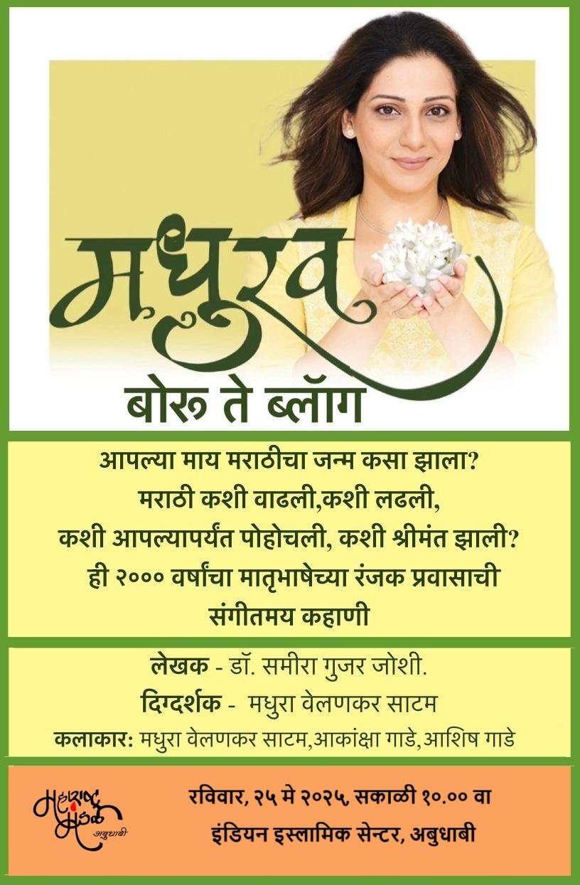 नमस्कार मंडळी, महाराष्ट्र मंडळ अबुधाबी घेऊन येत आहे, नाट्य, नृत्य आणि संगीत यांच्या संगमातून मराठी भाषेचा उगम आणि तिचा उत्क्रांतीशील प्रवास; ज्या अभिनव प्रयोगाची विशेष दखल घेतली गेली आणि राजभवनात सादरीकरण झालं, अशी मराठी साहित्याच्या सौंदर्याला आणि परंपरेला समर्पित एक संस्मरणीय सांस्कृतिक अनुभूती, मधुरव - बोरू ते ब्लॉग. वेळ - रविवार, २५ मे २०२५, सकाळी १०.०० वा स्थळ - इंडियन इस्लामिक सेन्टर, अबुधाबी (https://maps.app.goo.gl/XS2JbvpWqCTBY5hV9) अधिक माहितीसाठी संपर्क - श्री. विजय माने - ०५०८१५८३२४ श्री. सचिन राजे - ०५०३९२३०३९ सचिन शिंदे - ०५०५२७२६०९ प्रवीण मोरे - ०५६९४७२५१८ धन्यवाद, महाराष्ट्र मंडळ, अबुधाबी कार्यकारी समिती २०२५-२६ ॥ अभिजात मराठीचे वारकरी ॥