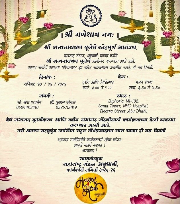 || श्री गणेशाय नमः || श्री सत्यनारायण पूजेचे स्नेहपूर्ण आमंत्रण महाराष्ट्र मंडळ, अबुधाबी यांच्या वतीने श्री सत्यनारायण पूजेचे आयोजन करण्यात आले आहे. सोबतचं भजनसंध्या ह्या विशेष कार्यक्रमाचे सुद्धा आयोजन करण्यात आले आहे. तरी आपण सर्वांनी आपल्या परिवारासह ह्या पवित्र सोहळ्यास उपस्थित रहावे, ही नम्र विनंती. विशेष सूचना : • वैध सभासद नूतनीकरण आणि नवीन सभासद […]